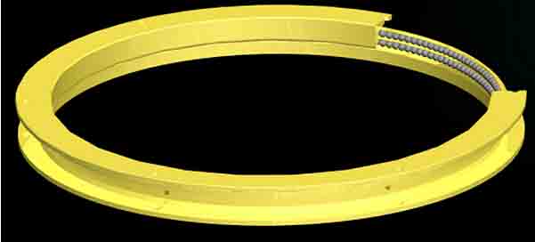 合面上的推力滚道。另一个是设在垂直配合面上的向心滚道。两道滚珠对不同方向的载荷的承载各有分工,且相辅相成,从而承载能力大大提高。特别是由于转盘的横向和纵向承载能力的增大,因而可避免全挂车车辆在转弯或紧急制动时发生翻车事故。特别适应我国现有的道路条件。本转盘使用寿命长,加工工艺简单易行,安全可靠。